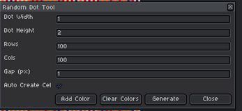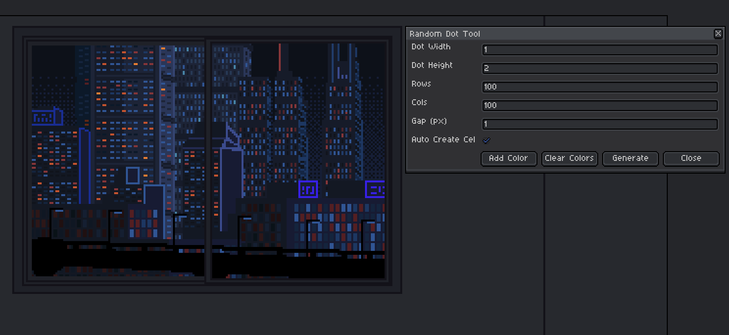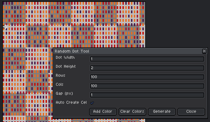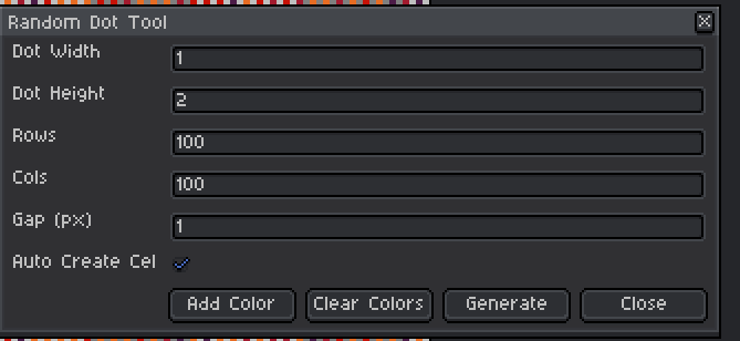 Random dot generator for Aseprite with customizable size, spacing, and color.